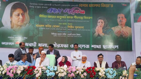 এম আর মাইনউদ্দীন, নরসিংদী। তিনবারের সাবেক প্রধানমন্ত্রী ও বিএনপি চেয়ারপার্সন দেশনেত্রী বেগম খালেদা জিয়া’র সুস্থতা কামনায় মাধবদী থানা,পৌরসভা ও কলেজ ছাত্রদলের উদ্যোগে কাঠালিয়া ইউনিয়ন উচ্চ বিদ্যালয় মাঠে “মিলাদ ও দোয়া মাহফিল” এবং অসহায় মানুষের মাঝে শীতবস্ত্র বিতরণ করেন। এ সময় প্রধান অতিথী হিসেবে উপস্থিত ছিলেন জনাব খায়রুল কবির খোকন সাবেক এম,পি যুগ্ম মহাসচিব,বিএনপি উদ্বোধক: শিরিন